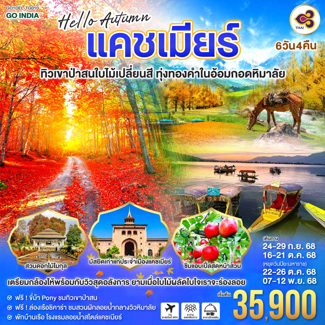 เตรียมกล้อง ให้พร้อมกับวิวสุดอลังการ ยามเมื่อใบไม้ผลัดใบใจเราจะร่องลอย ชิม แอบเปิ้ล สดหน้าสวน ชมมัสยิดเก่าแก่และศักดิ์สิทธิ์ ประจำเมืองแคชเมียร์ - ฟรีขี่ม้า Pony ชมทิวเขาป่าสน - ฟรี ล่องเรือชิคาร่า ชมสวนผักลอยน้ำกลางวิวหิมาลัย - พักบ้านเรือ โรงแรมลอยน้ำสไตล์แคชเมียร์